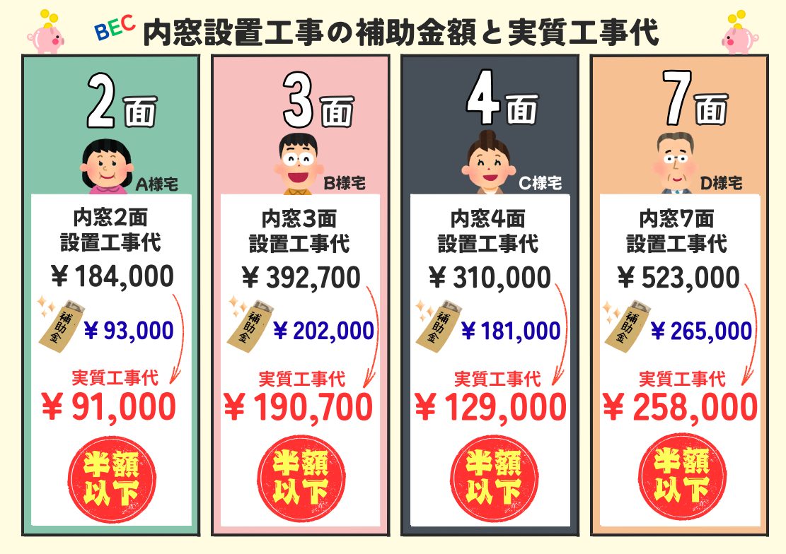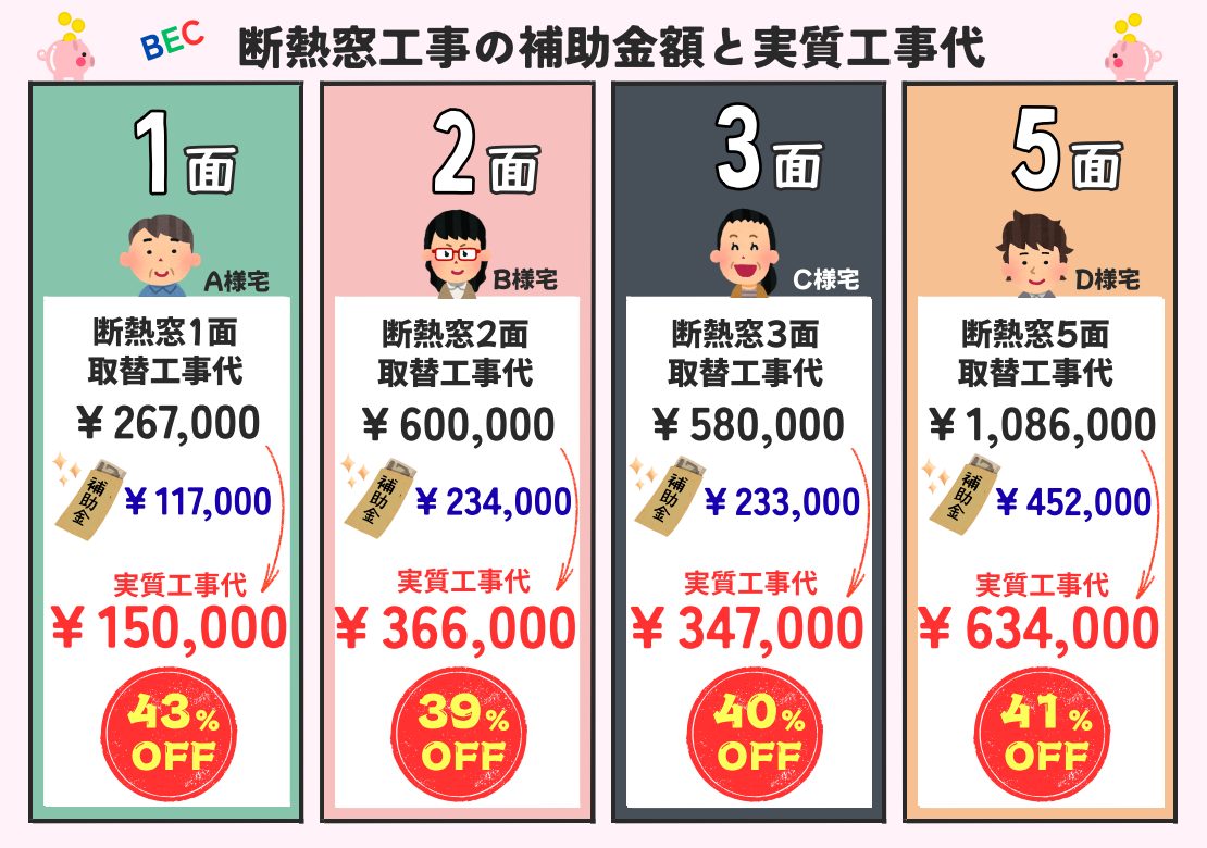 窓の大きさや面数によって補助金額が変わりますが、みなさん40~50%の割引で実際に工事をされている結果となりました!(^^)!