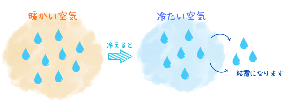 空気中の水蒸気は含むことができる量が決まっていて、温度が高いとその量は増え、低いと減ります。温度が低くなると空気中から水蒸気が追い出され、水滴となって現れるのです。