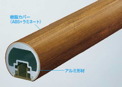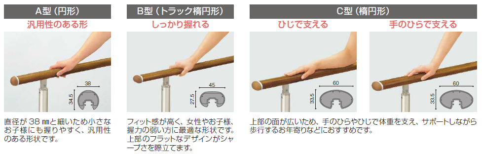 丸型(円形)手すりが最も握りやすく手にフィットしやすい形状です。