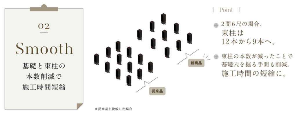 デッキ下の構造材(束柱と大引)の本数が削減され、施工性がアップし、従来より短い時間での施工が可能になります!