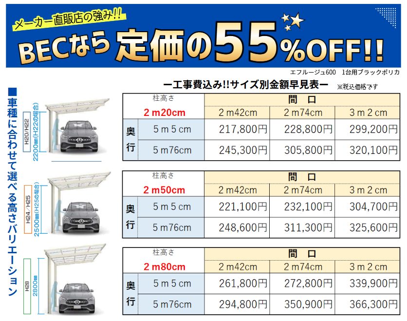 | 商品名 | エフルージュ FIRST 600タイプ 1台用 51-24 基準風速V0=34m/s地域まで対応 ブラックポリカ屋根 |