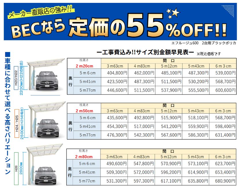 ■BEC工事費込み!!サイズ別金額早見表■
