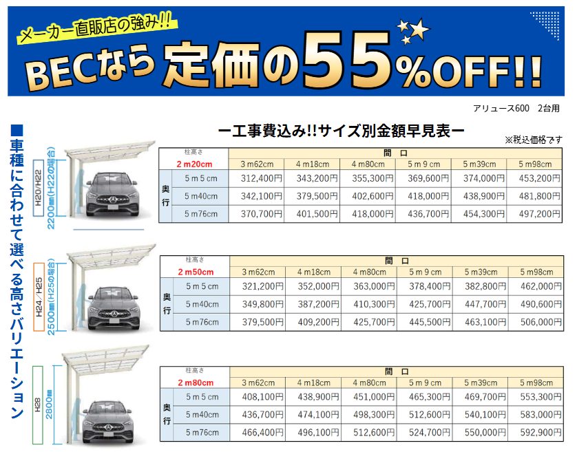 ■BEC工事費込み!!サイズ別金額早見表■