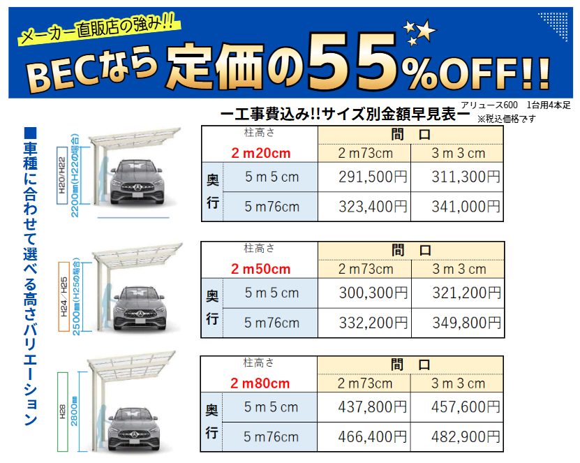 ■BEC工事費込み!!サイズ別金額早見表■